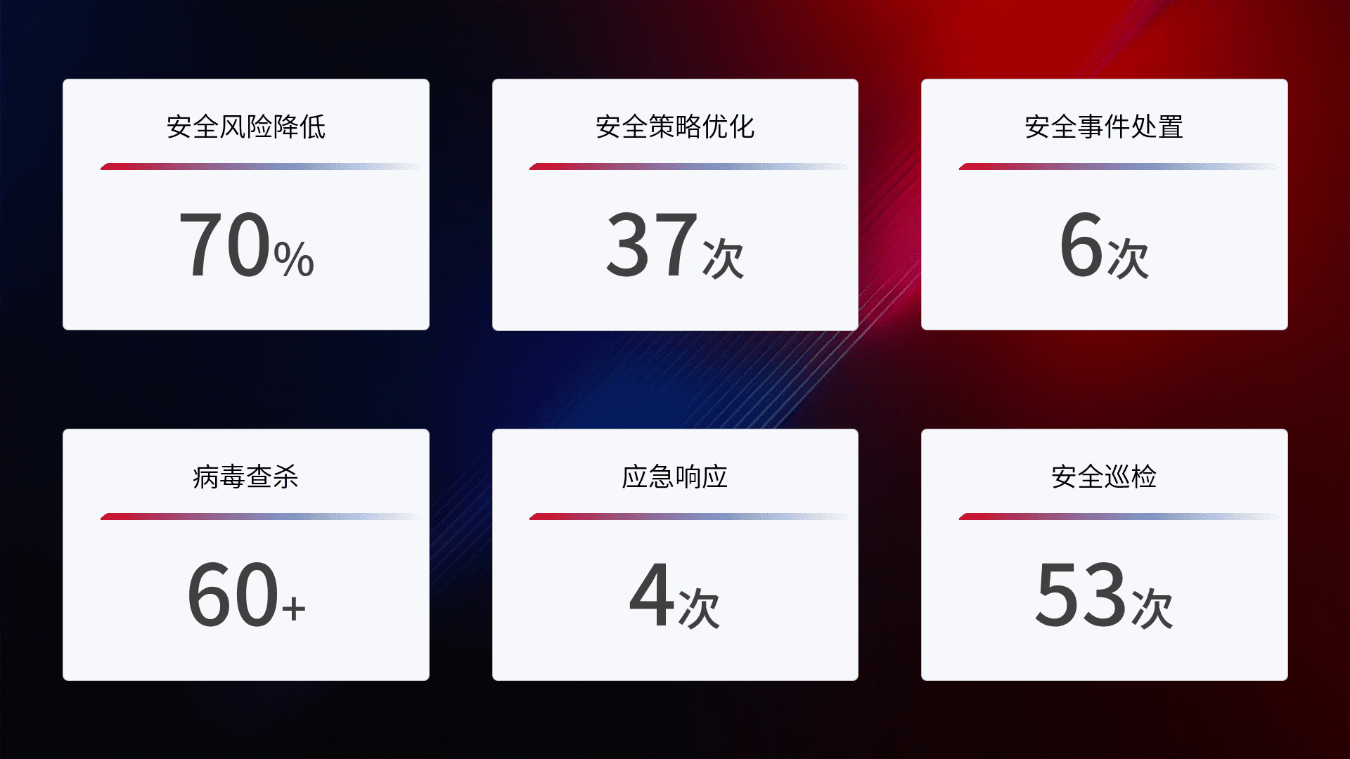 提供全面的安全事件报告体系,,,包括处置报告、、、、周报、、季度和年度总结,,结合持续监控,,,帮助客户深入了解网络安全状况。。。。