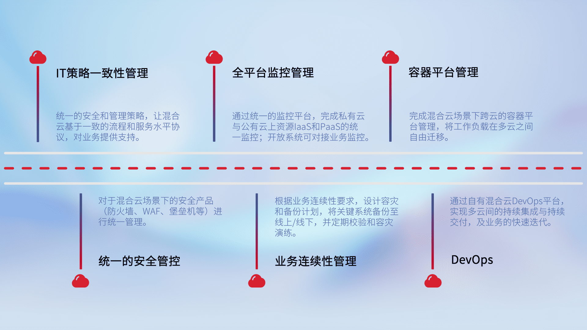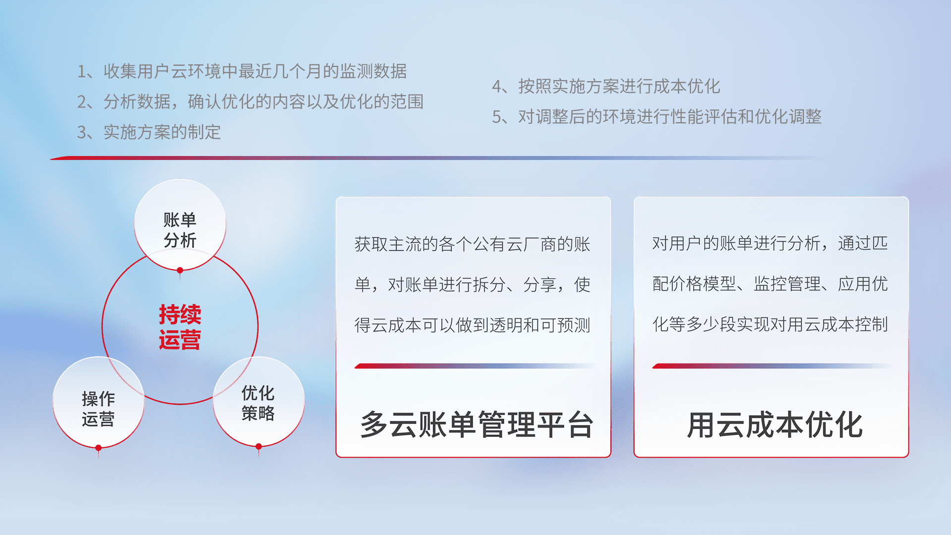 通过多云纳管,,,以统一的资源数据模型把客户的云资源进行抽象和封装,,进而实现对多云资源的统一操作,,保障云资源管理的可靠性、、、、稳定性与可用性。。。。量身定制化运维内容,,配置、、、、开发运维、、、补丁管理、、、备份、、、、监控、、、认证和访问管理、、审计和日常巡检等,,,,保障在用云过程中的可靠度,,,稳定度以及高可用率。。。。