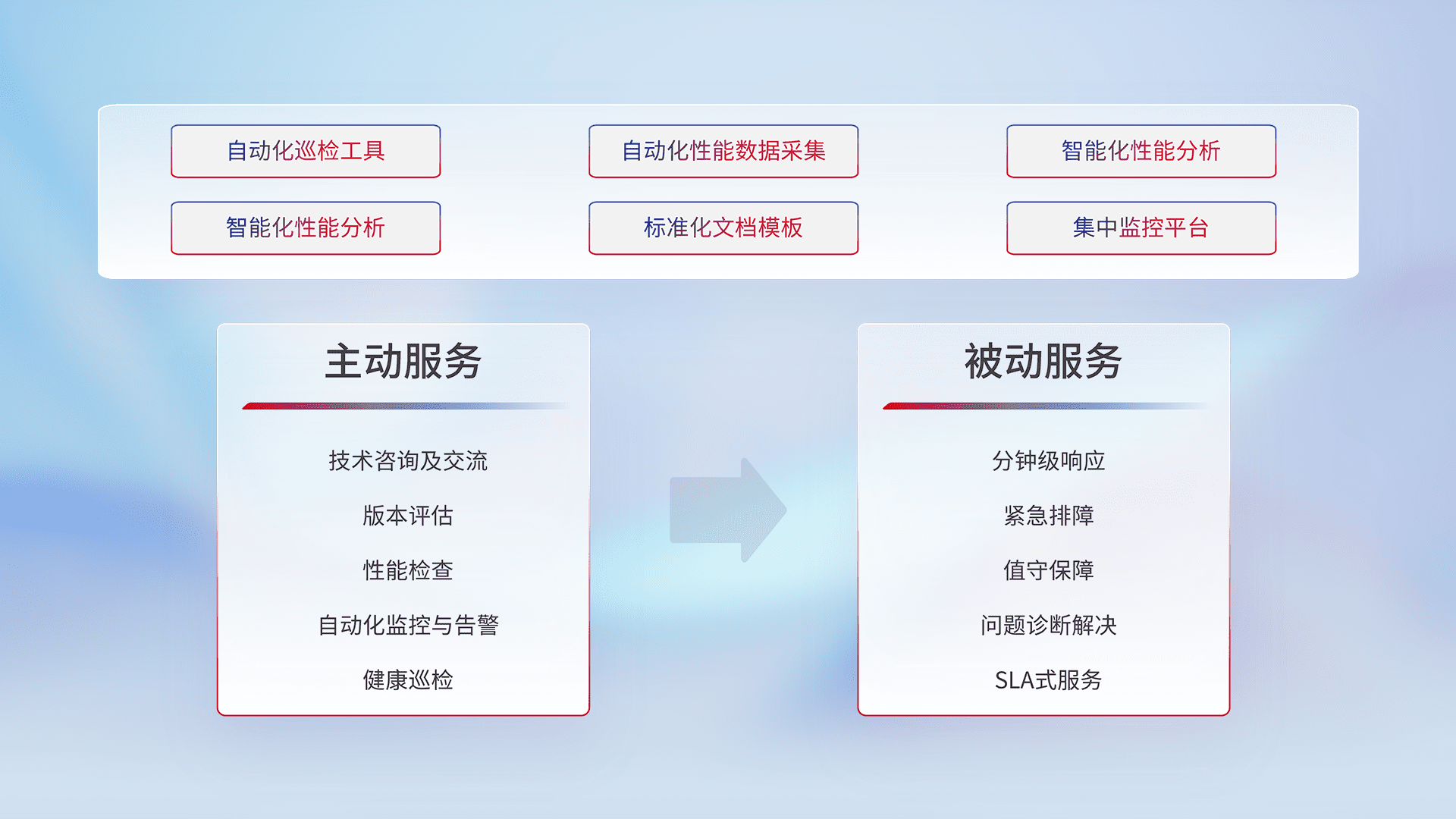 智能化工具和标准化文档,,,,保障服务质量,,提供主动服务(包含技术咨询、、、、版本评估、、、性能检查、、自动化监控与告警、、健康巡检)和被动服务包含(分钟级响应、、、、紧急排障、、、值守保障、、、问题诊断解决、、SLA服务)。。。。